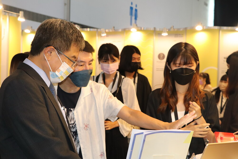 今年學生作品相當多元,也有不少是實際產業委託案例並在完成後完成移交,包括高雄市公車業者漢程客運推動電動公車,由文創系學生設計車體及車內塗裝;與在地甜點店合作的添花設計行銷;趣味性劇情教學英文的YouTube頻道「愛英斯坦」;以短篇故事和插圖結合,研究人類情緒的書籍;與大寮愛家園合作打造的全新品牌山仔頂直販所;研究全台月老不同職掌的《愛情中教學》;攝影底片拍下日常生活而成的《底家》等,楊校長仔細聆聽同學的介紹,翻閱刊物,彼此交換意見,互動熱絡。