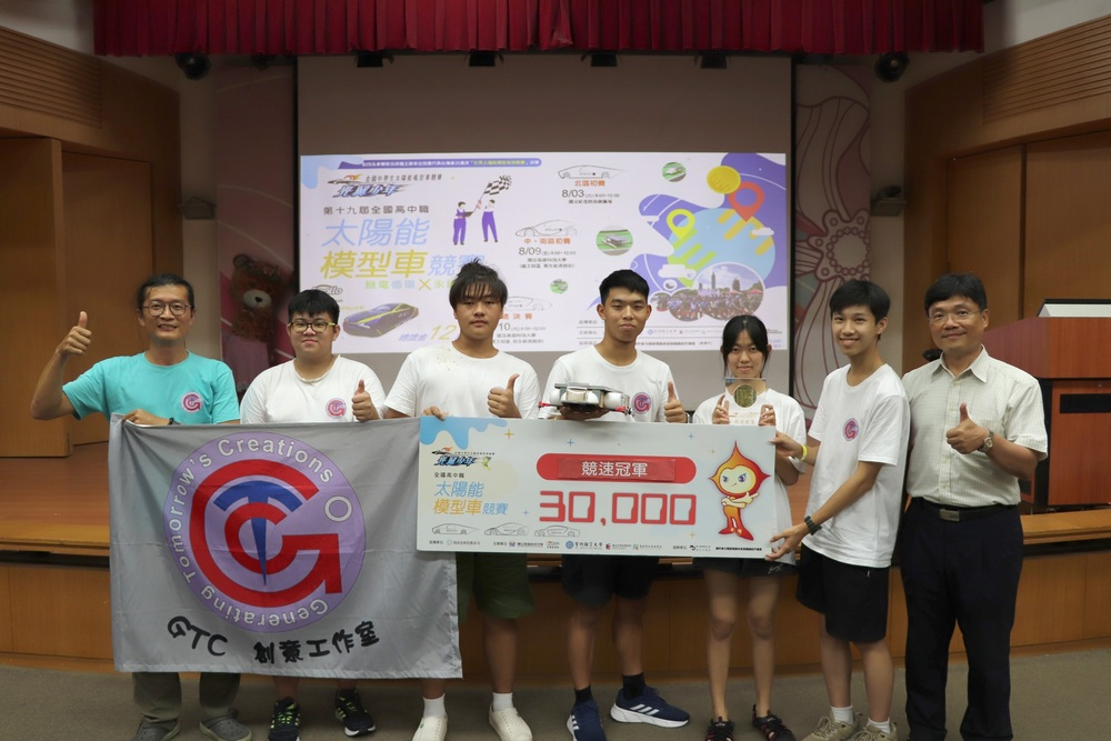 來自全國各高中職24支太陽能模型車隊,在本(8)月10日舉辦第19屆太陽能模型車決賽賽程,今年逢高雄連日降雨,在陰雨中完成熱血賽程,由高雄高工「???獵鷹_GTC」奪得競速冠軍,並且名列總積分最高隊伍,高雄高中跨校組隊「追日少年-GTC」、大興高中「無名之輩」分別獲得第二、第三名。