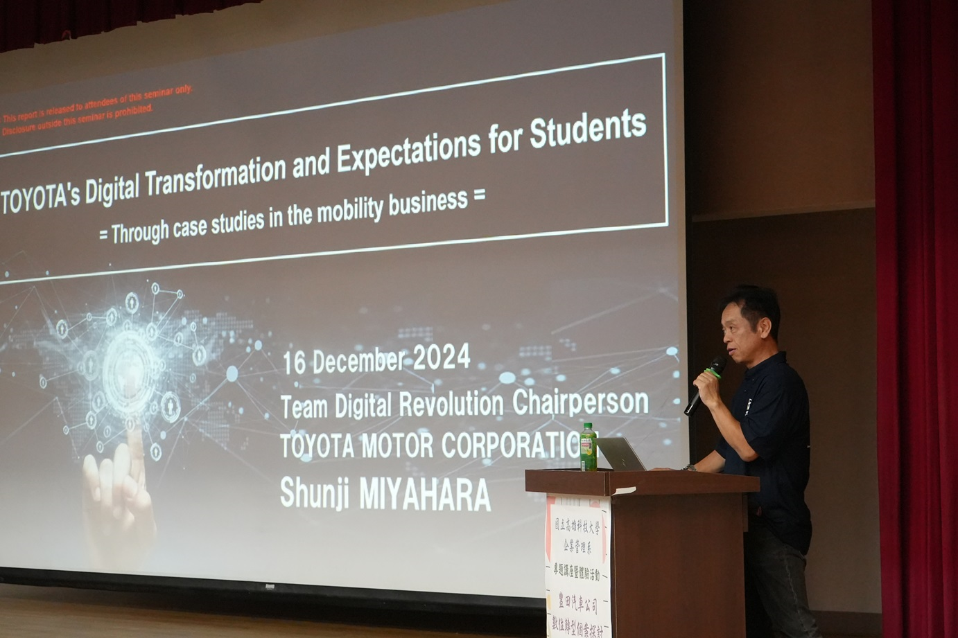 課程特別邀請豐田汽車數位轉型推進部總專案經理宮原俊治先生(Shunji Miyahara)蒞臨現場,分享豐田在數位轉型領域的寶貴經驗,並以理論結合實務,講解數位工具如何重塑汽車產業,並分享豐田在台灣及國際市場的實際經驗與未來發展藍圖。此外,宮原經理也勉勵學生在數位時代的挑戰中,勇於發掘自身潛力,積極迎接變革。