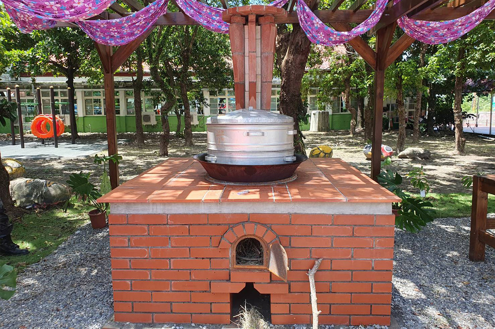 高科大「角映義築」團隊,自今年1月起展開探勘與討論工作,接著在6月29日至7月5日於新威國小完成施作工程。計畫主持人、高科大營建系教授林建良表示,有別以往的方形灶台,角映義築團隊所打造的傳統客家灶,是以客家族群務農為生的概念,利用磚造了一個斗笠形的煙囪頂,與客庄務農生活有更契合的符號連結。高科大營建系助理教授謝秉銓補充說明,灶台的內部採用耐火磚及耐火泥的構材,可增強磚灶的耐用度,在木結構遮陽架的設計上對應到了客家族群的分佈,有六堆和六龜的「雙六」意涵再其中。